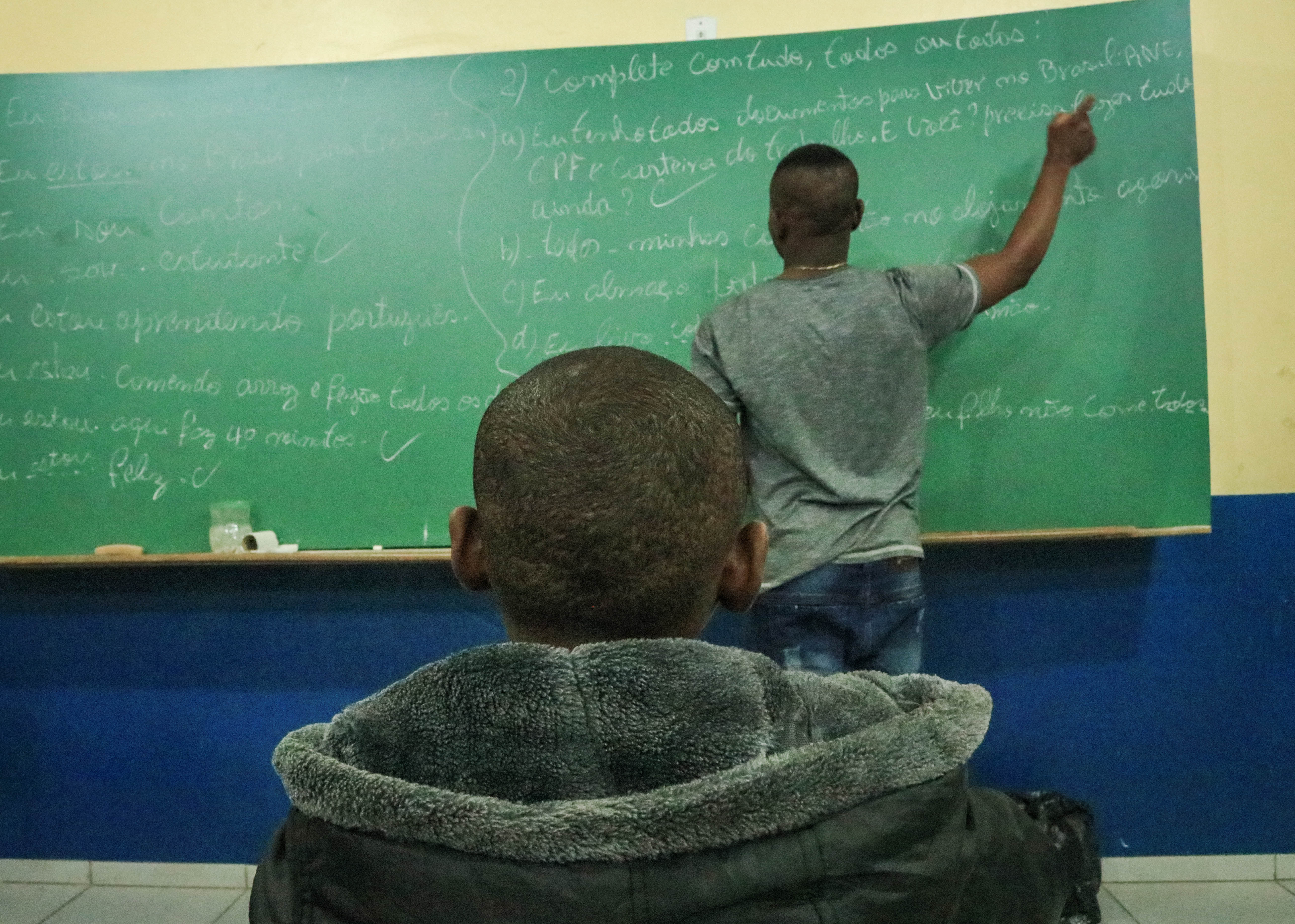 Nem o domingo chuvoso e frio tira o ânimo de quem precisa aprender a língua portuguesa. Cada palavra descoberta e cada frase completada são passos a mais para ter melhores chances no mercado de trabalho e melhor comunicação no novo lar. Com a ajuda do smartphone, consultando um site de busca, Michelson Gachette, um jovem haitiano de 19 anos, faz o papel de professor. Na sala de aula, dentro do Centro de Atenção Integral à Criança e ao Adolescente (CAIC) de Navegantes, as histórias se cruzam e a meta é uma só: aprender o idioma.