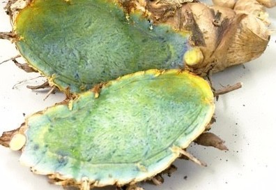 Rizoma da zedoária com coloração azul-esverdeada. Reprodução: