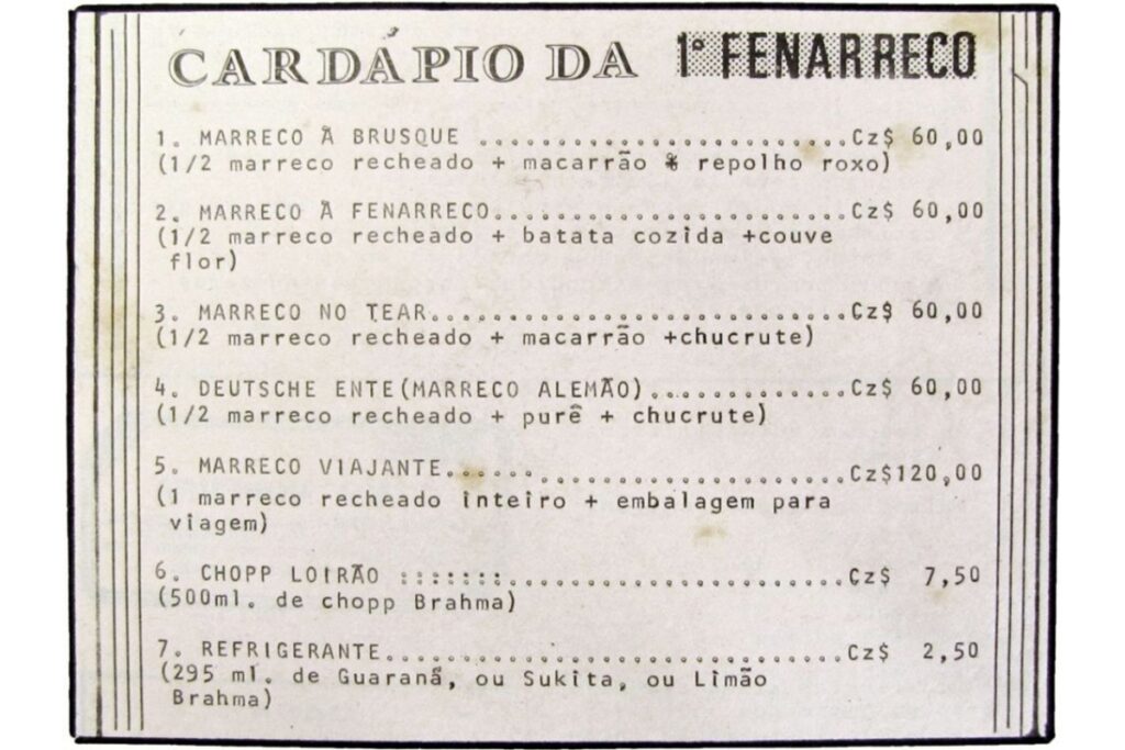 Na primeira edição da Fenarreco, em 1986, mil marrecos foram preparados para alimentar o público durante os dias de festa. No segundo dia, já não havia mais nenhum. “A gente não tinha ideia da quantidade de pessoas que iria. Foi uma surpresa, uma loucura total”, relembra o chef brusquense Oscar Campi, responsável pela cozinha nas seis primeiras edições do evento.
