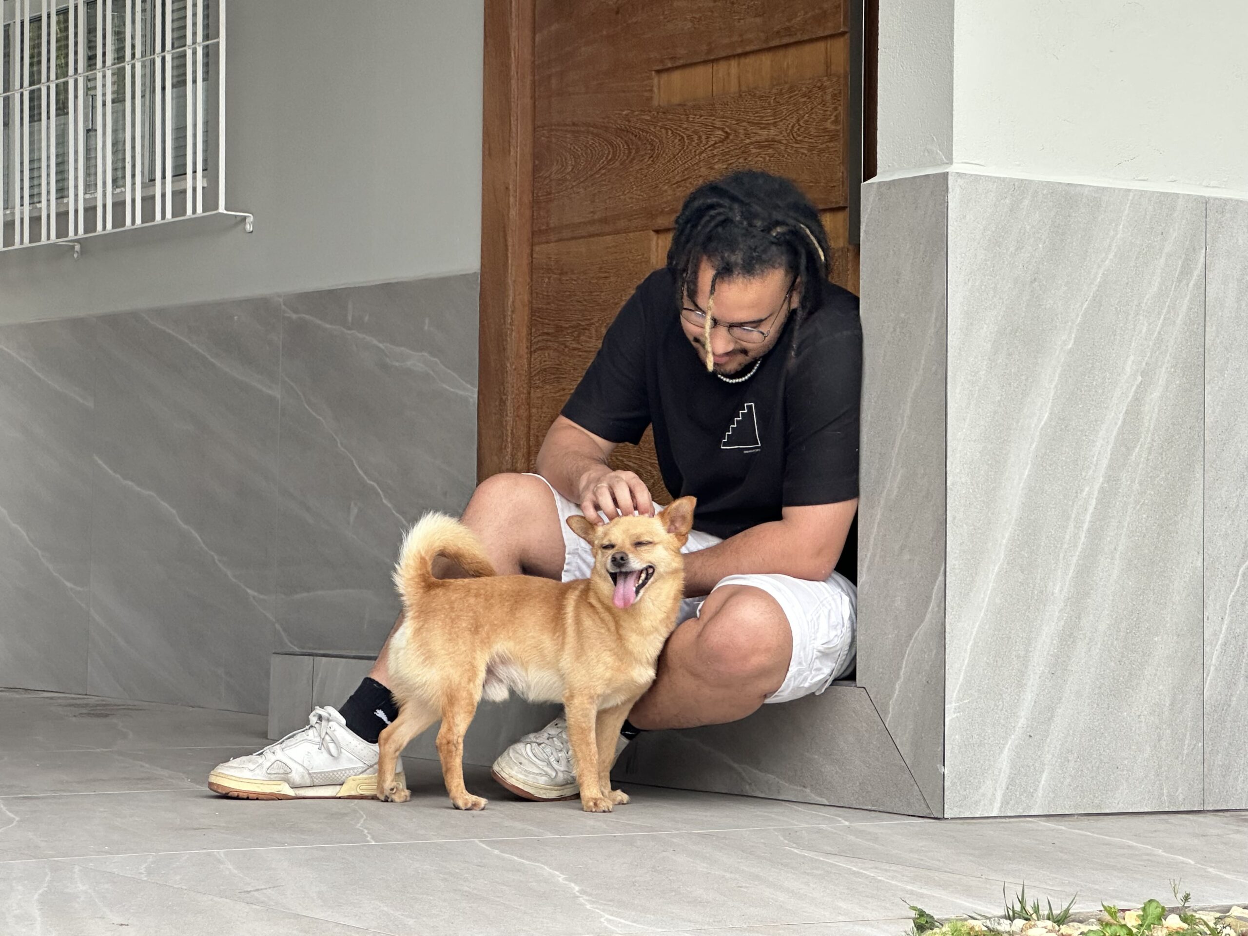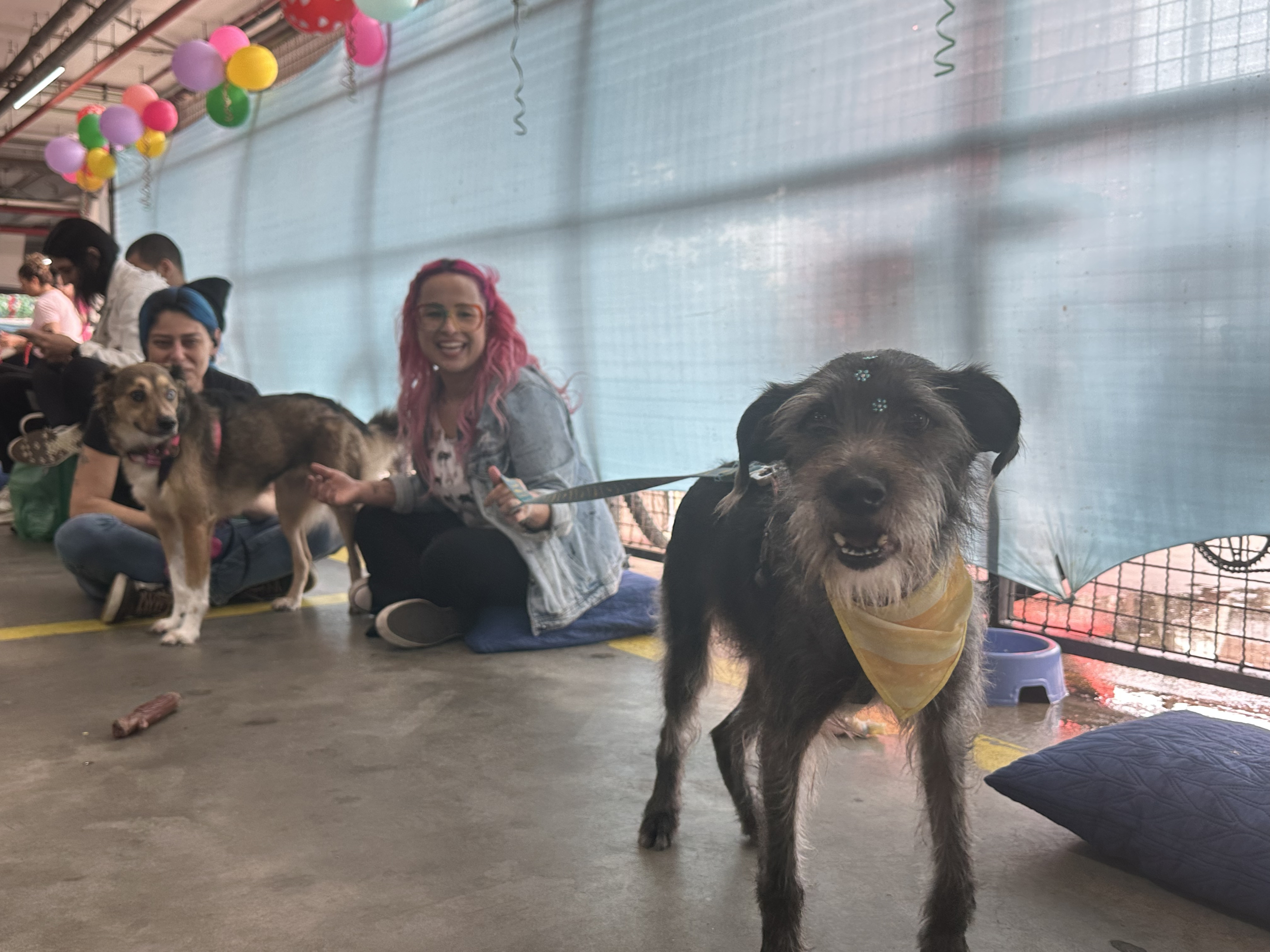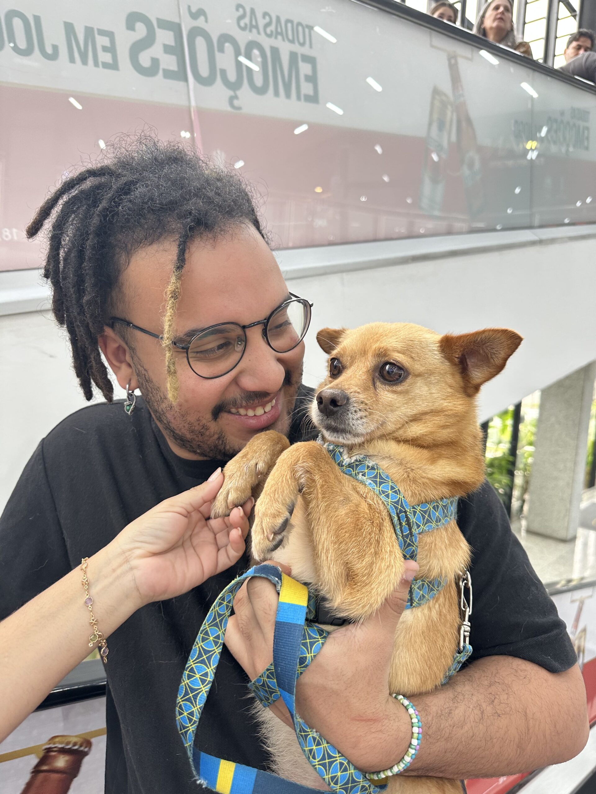 Depois de passar por lares temporários, receber cuidados veterinários e participar de uma feira de adoção, o Paçoca encontrou o Manu. O encontro, que começou com um olhar curioso entre os cercadinhos da feira, virou conversa em casa, decisão em família e, por fim, compromisso.