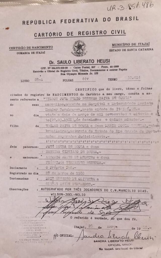 A relação de Wilson Joel Nélio Bezerra Paiva de Souza com o Marcílio Dias começou antes mesmo de ele nascer. Filho de uma família apaixonada pelo Marinheiro, ele chegou ao mundo em 22 de março de 1988, um dia depois da vitória por 1 a 0 sobre o Joinville, pela Taça Carlos Renaux. O gol de Wilsinho naquele jogo decisivo inspirou seu primeiro nome. No duelo da volta, que terminou em 3 a 3, Joel e Nélio deixaram suas marcas e também acabaram eternizados na certidão de nascimento do novo torcedor. Até o árbitro da partida, Bezerra, carregava que concidentemente tinha mesmo sobrenome da mãe. Para completar a história, os três jogadores que inspiraram seu nome foram ao cartório e assinaram como testemunhas.